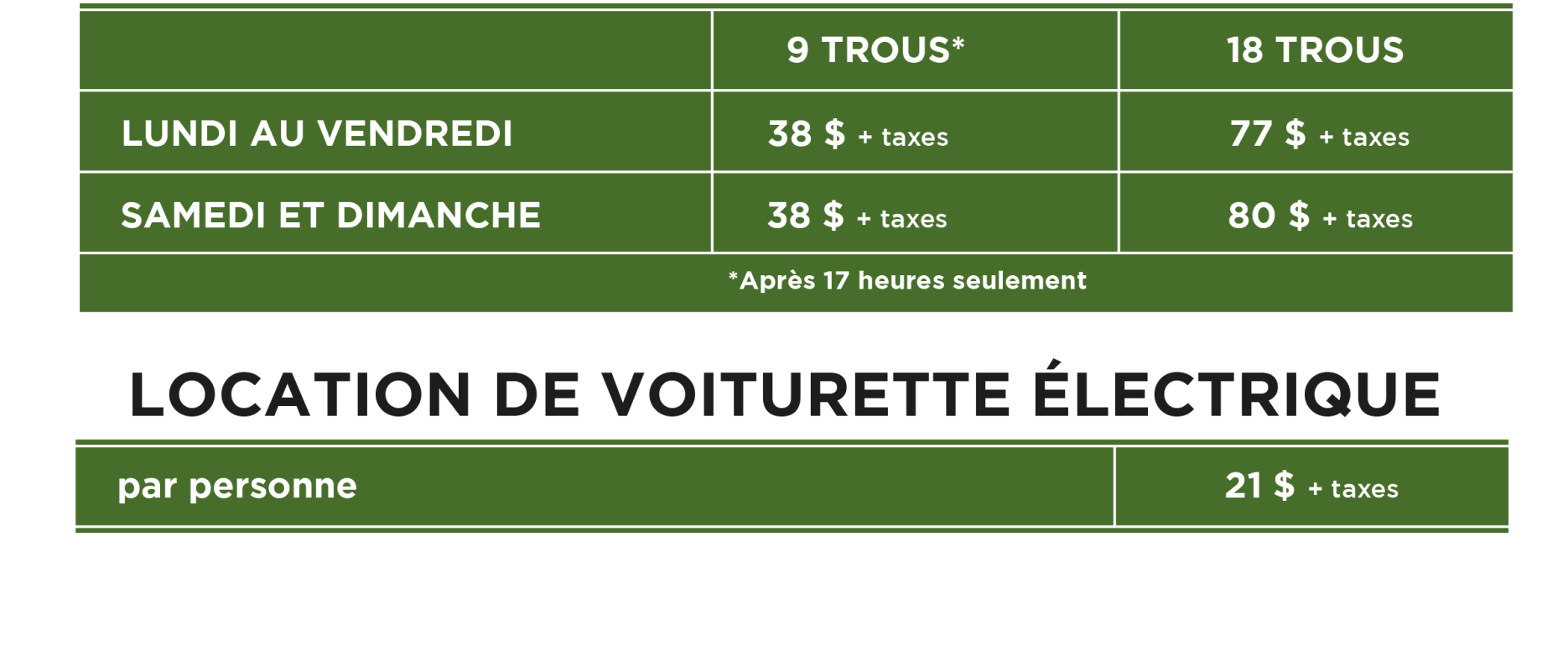 Offrez-vous la satisfaction en devenant membre d’un Club de golf situé dans les limites de la ville de Québec, facilement accessible, parfaitement manicuré et vous garantissant des conditions de jeu incomparables. Notre offre segmentée vous permettra d’accéder au forfait qui correspond à votre objectif et vos intérêts qu’ils soient; social, compétitif, en couple, individuel. Consultez l’éventail de nos choix de catégories de membre et l’offre des services complémentaires.